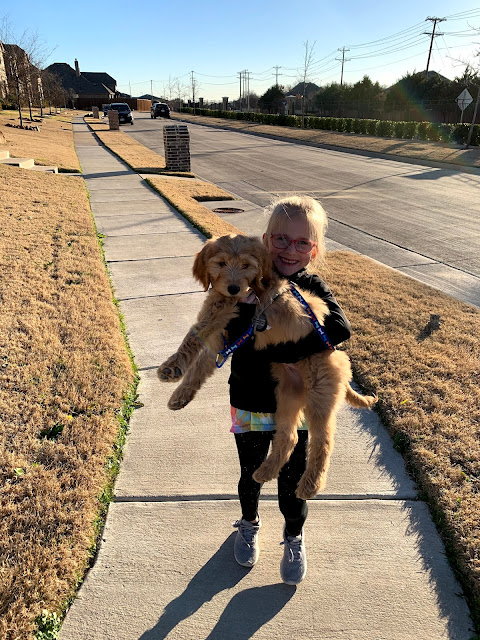 I walked Ranger to school to pick up the kids. It was a little overwhelming. Haha. Between Ranger not really getting "how to be walked" and all the attention he got from everyone I was exhausted when we got home. Probably won't be doing that again for while. lol